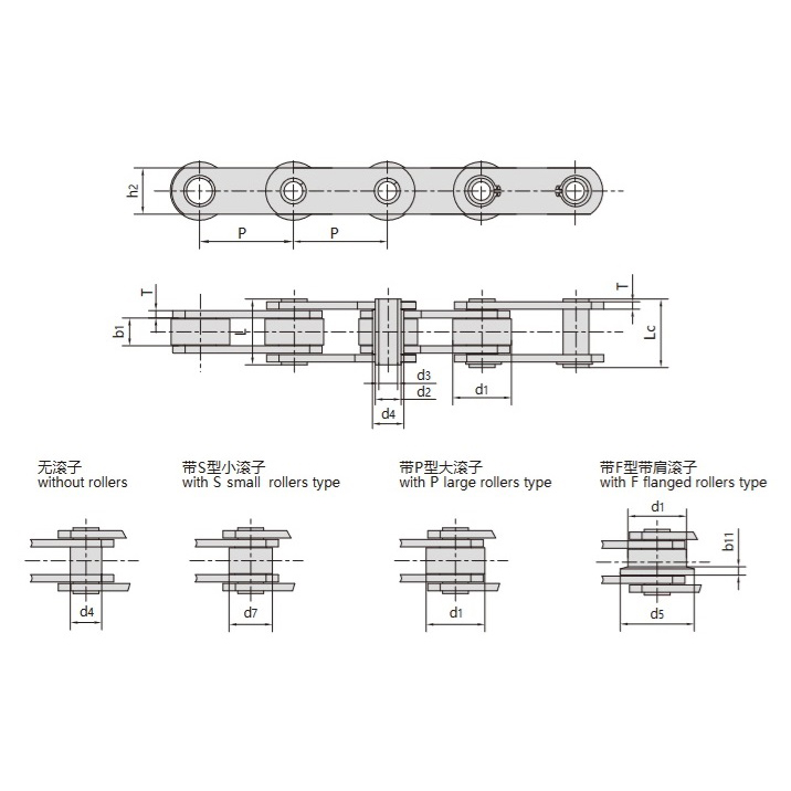 - Na voljo v izvedbi brez valjčkov ali opremljen z majhnimi valjčki tipa S, velikimi valjčki tipa P in ramenskimi valjčki tipa F za različne potrebe prenosa.